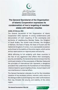 İslam İşbirliği Teşkilatı (İİT) Genel Sekreterliği, İran’ın komşu üye devletlerin egemenliğini ve topraklarını hedef almasını güçlü bir şekilde kınadığını ve bunu şiddetle reddettiğini ifade etmektedir. Bu devletler; Suudi Arabistan Krallığı, Birleşik Arap Emirlikleri, Bahreyn Krallığı, Katar Devleti, Kuveyt Devleti ve Ürdün Haşimi Krallığı’dır. Söz konusu eylemler kabul edilemez bir tırmanış olup, tüm bölgenin istikrarına yönelik bir tehdit teşkil etmekte ve bölgesel barış ile güvenlik üzerinde ciddi sonuçlar doğurmaktadır.