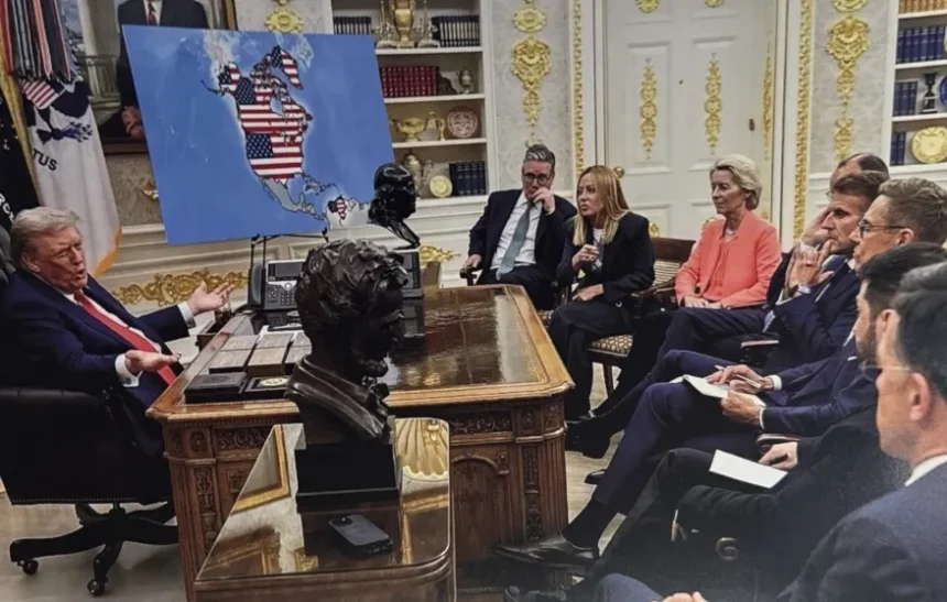 Görsellerden birinde Trump, aralarında Fransa Cumhurbaşkanı Emmanuel Macron, İtalya Başbakanı Giorgia Meloni, İngiltere Başbakanı Keir Starmer ve Avrupa Komisyonu Başkanı Ursula von der Leyen’in de aralarında bulunduğu kişilerle Oval Ofis’te otururken tasvir edildi.